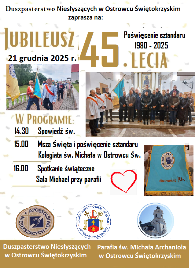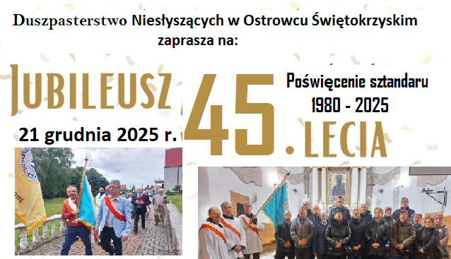 Zapraszamy na Jubileusz 45-lecia Duszpasterstwa Niesłyszących w Ostrowcu Świętokrzyskim połączone z poświęceniem sztandaru duszpasterstwa w niedzielę, 21 grudnia 2025 r.